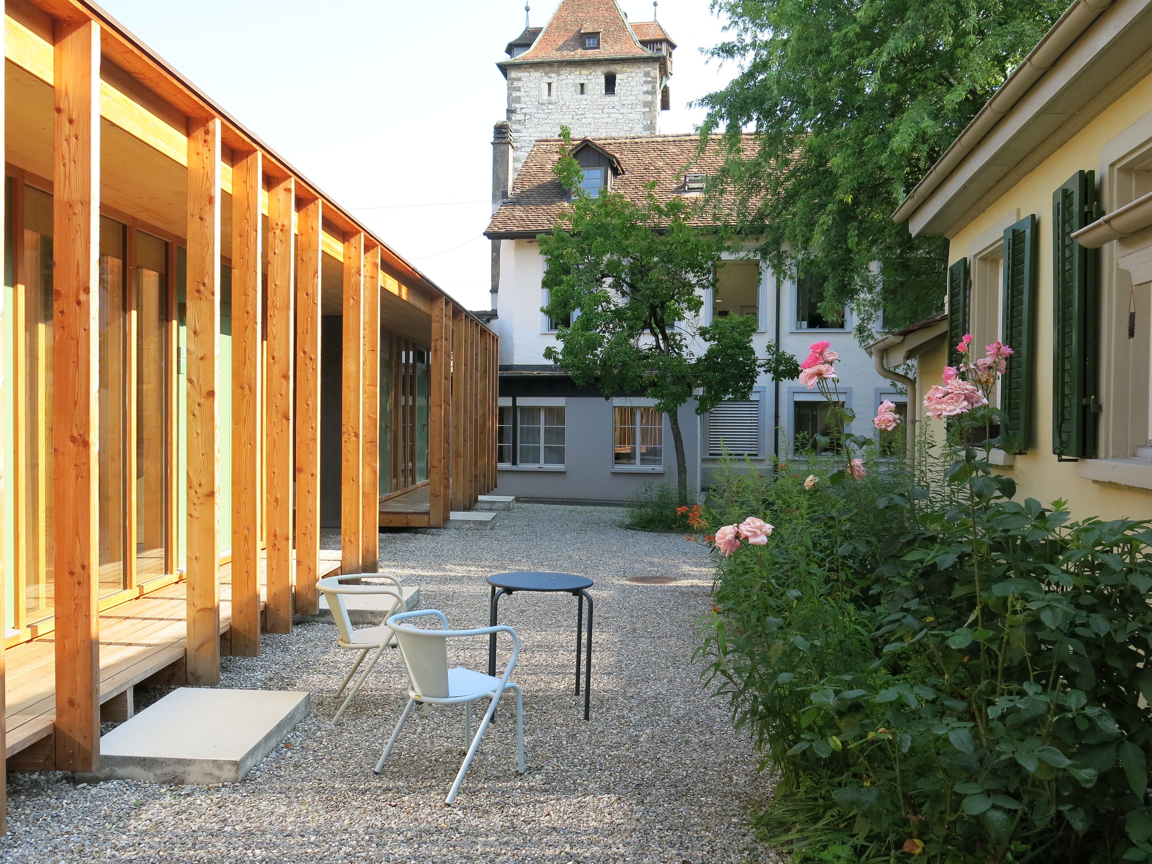 Innen- und Hinterhöfe sind ein wenig bekannter, aber besonders spannender Teil der Altstadt Schaffhausen. Ein geschichtsträchtiger und gut erhaltener Hinterhof besteht an der Neustadt entlang der mittelalterlichen Stadtmauer und im früheren Stadthof der Roten von Randenburg. Als Ersatz für einen Werkstatt- und Schopfbau entstanden hier 2023 moderne Atelierhäuser. Mit den beiden Atelierhäusern wurden hochwertige Arbeitsräume realisiert und gleichzeitig der historische Innenhof sanft aufgewertet.