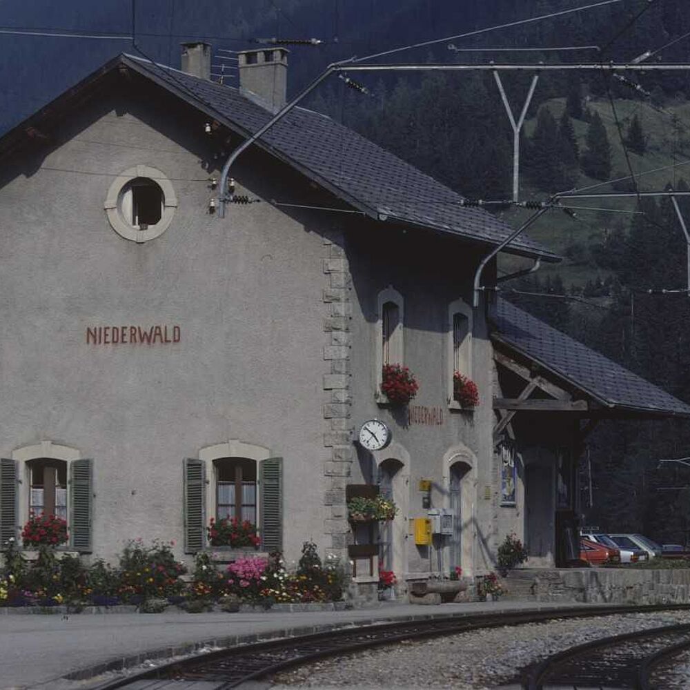 Das Bahnhofsgebäude von Niederwald gehört zu neun baugleichen Stationen, die eine Baufirma aus Frankreich 1913 nach Vorbild von französischen Nebenbahngebäuden entlang der Brig–Furka–Disentis-Bahnstrecke erstellte. 2019 zur Station Ritz umgenutzt, beherbergt der alte Bahnhof Niederwald heute ein Bis...