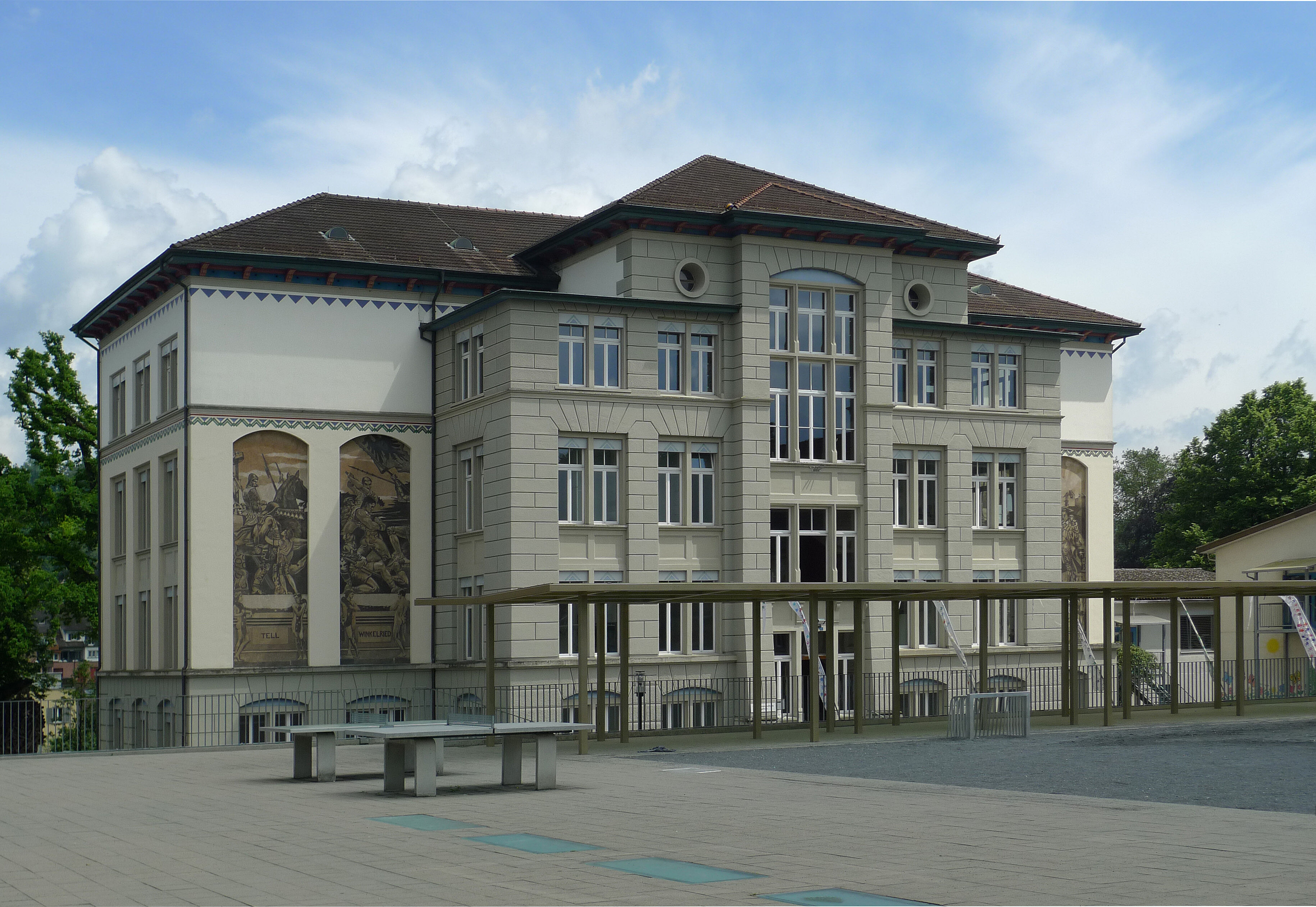 Das Schulhaus Angelrain wurde 1902/03 nach Plänen des Lenzburger Baumeisters Theodor Bertschinger junior errichtet. Der künstlerische Schmuck des palastartigen Baus im Stil des Historismus stammt von zwei Lenzburger Künstlern, mit denen Bertschinger auch andernorts zusammenarbeitete: Kunstmaler Werner Büchly, der die monumentalen dunkeltonigen Sgraffiti mit epischen Bildzyklen und die Wandmalereien im Singsaal schuf, sowie Bildhauer Arnold Hünerwadel, der Reliefs und zwei Majolikabrunnen im Innern erstellte.