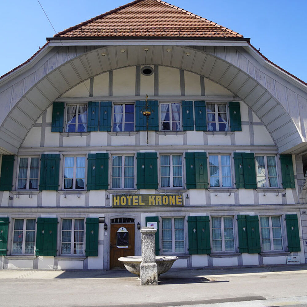 Das grosse Wohnhaus westlich ausserhalb des Städtchens Huttwil war 1750 errichtet und 1835 mit dem Tavernenrecht der «Krone» ausgestattet worden. Diese war bei einem Grossbrand im Städtchen verwüstet worden.