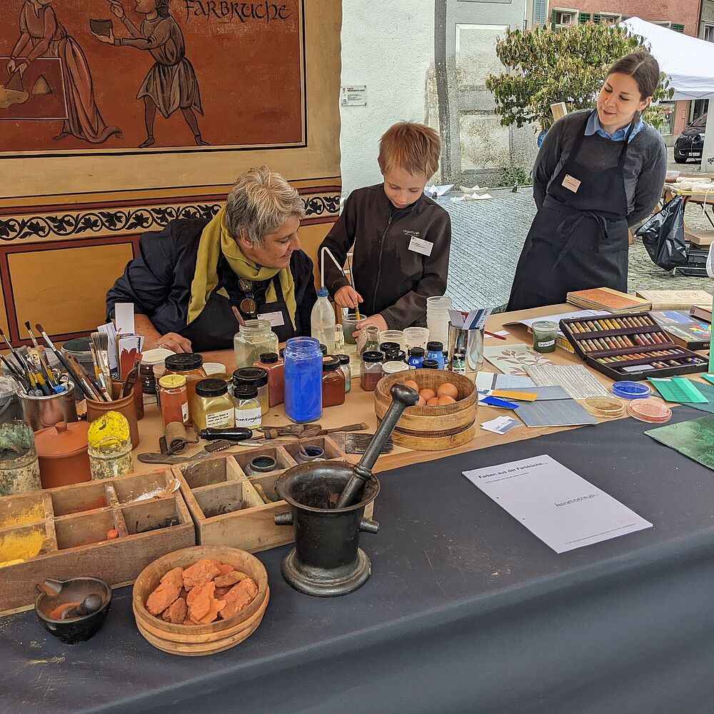 Wollten  Sie  schon  lange  einmal  Pigmente  anreiben,  mit  Eitempera  und  Leimfarbe  malen  und  sich  verschiedene  Techniken  von  Fachpersonen  erklären  lassen?  Dann  sind  Sie  an  diesem  Stand  genau  richtig:  Tauchen  Sie  in  die  farbenfrohe Welt der Restauratorinnen und Restauratore...