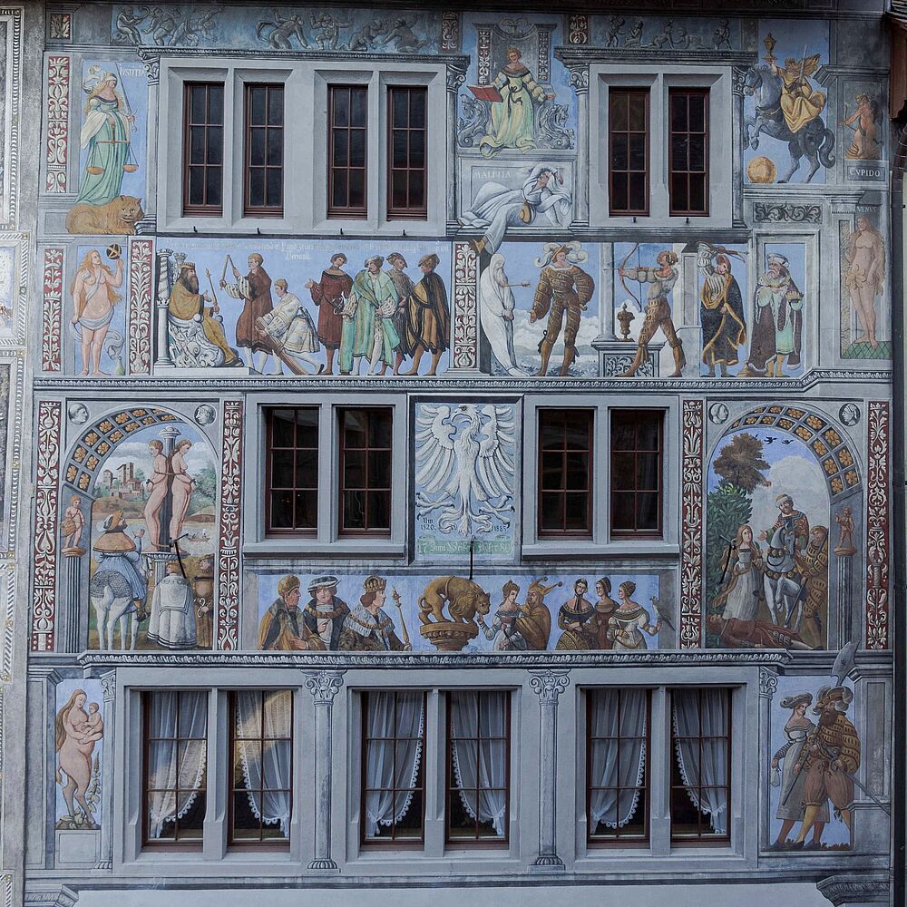 Der Rathausplatz mit den bemalten Fassaden gehört zu den drei Wahrzeichen Stein am Rheins. Unsere Tour d’horizon beginnt vor dem Weissen Adler mit den Fassadenmalereien aus der Frührenaissance. Über den Rothen Ochsen und die Spätrenaissance wenden wir uns dem Rathaus und der Welt des Historismus zu....