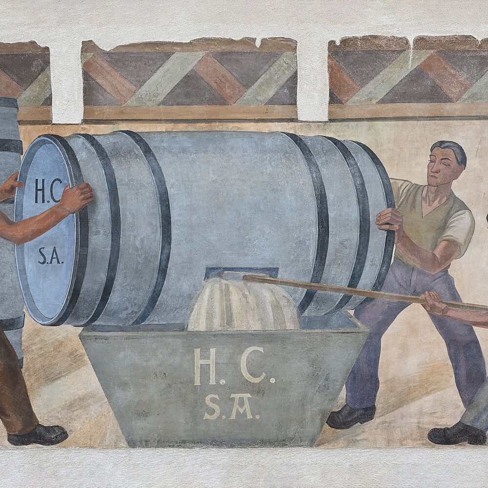 Au début des années 1930, l’architecte François-Casimir Besson conçoit les premières caves coopératives du Valais. En 1940, il est sollicité par Henri Carron pour agrandir sa cave à Fully. L’artiste Pierre Faval y réalise alors une fresque monumentale de plus de 36 mètres, illustrant la vigne, les p...