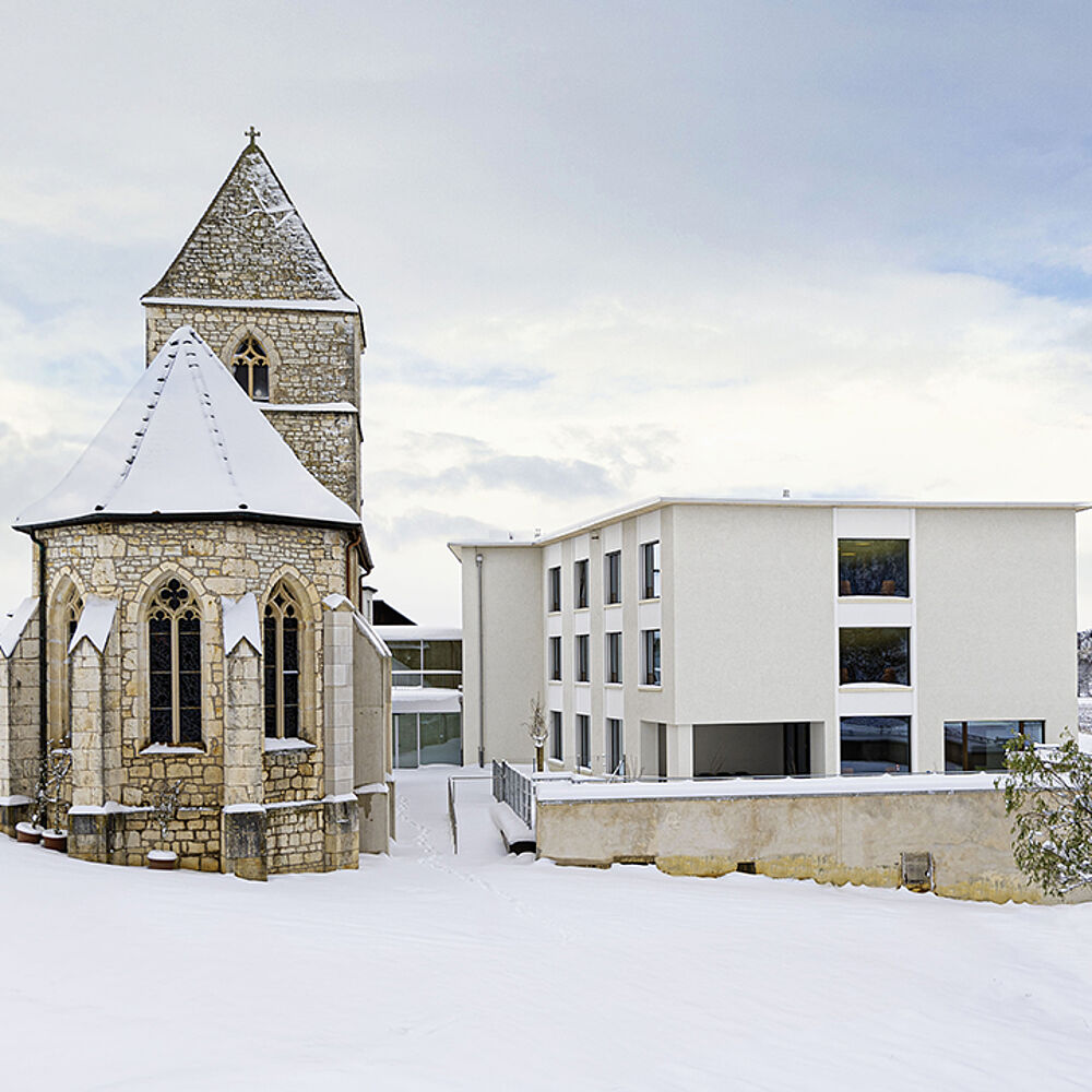 L’église Saint-Michel et la résidence Les Cerisiers à Miserez