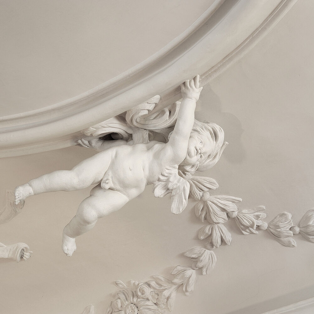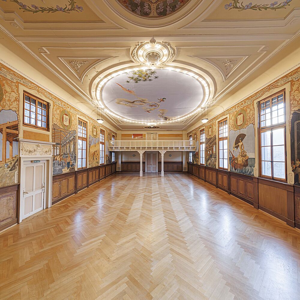 An den nachgotischen Mauerbau des alten Burghalden-Baus wurde ein rückwärtiger Teil angebaut, in dessen 1. Obergeschoss sich eine einzigartige Stuckdecke von 1710 befindet. Das Zentrum der Decke nimmt ein kreisrundes Mittelmedaillon mit einer kleinen sechsblättrigen Rosette ein. Am Medaillon hält si...
