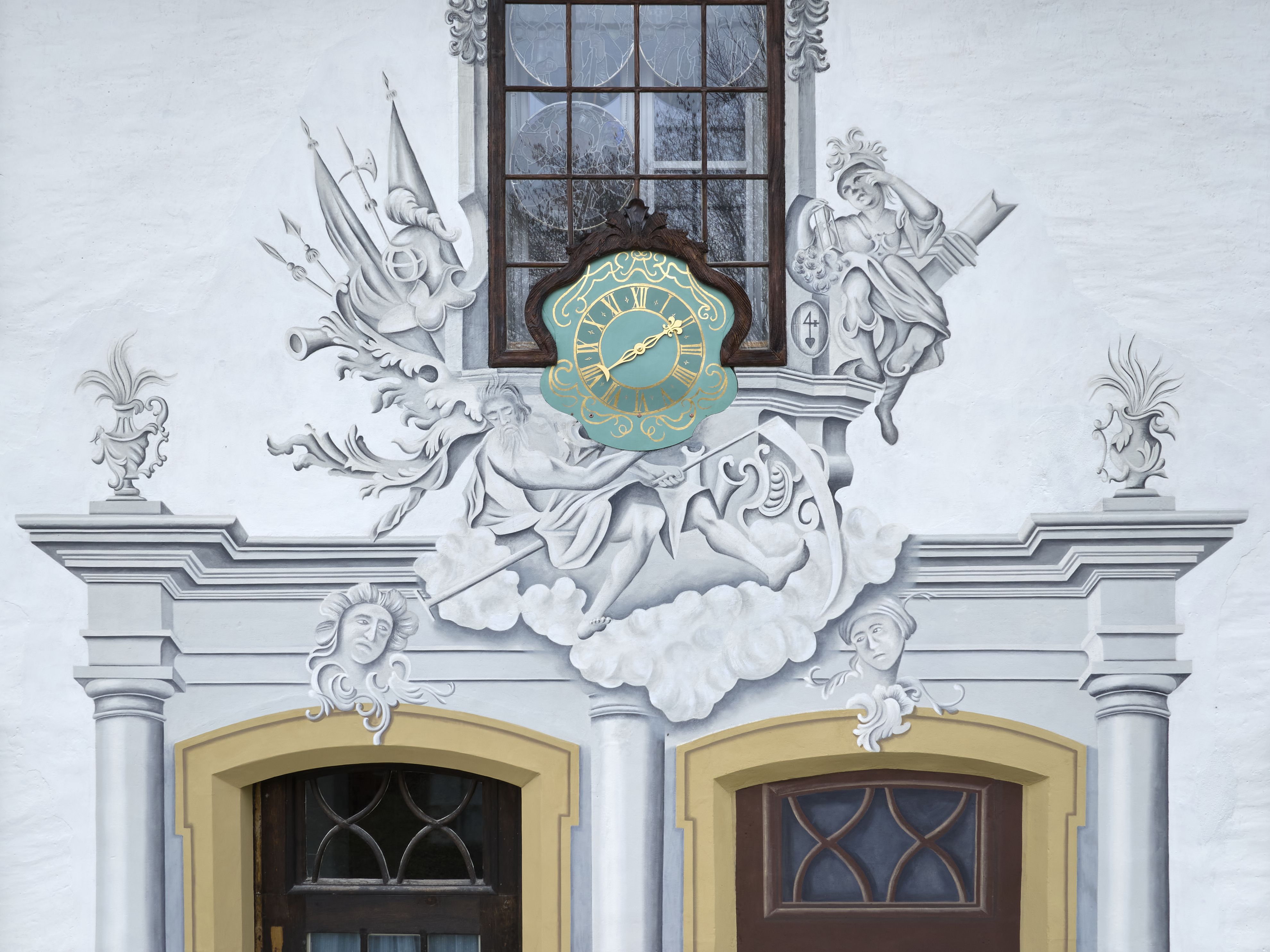 Vers 1743, François-Pierre-Nicolas de Gottrau confia à Melchior Eggmann, peintre de Rorschach, la création d’un trompe-l’œil baroque pour sublimer la façade de son château à Léchelles. Eggmann composa une architecture peinte en trompe-l’œil avec portes, fenêtres, colonnes, frontons et armoiries, dissimulant les irrégularités du bâtiment. Altérées par le temps et les intempéries, ces fresques étaient devenues peu lisibles. Elles ont été restaurées récemment avec finesse et selon les techniques traditionnelles du 18e siècle. Un relevé fidèle des proportions, des couches successives de glacis et l’usage de peinture au silicate ont permis de redonner toute sa splendeur à cette œuvre de haute volée.